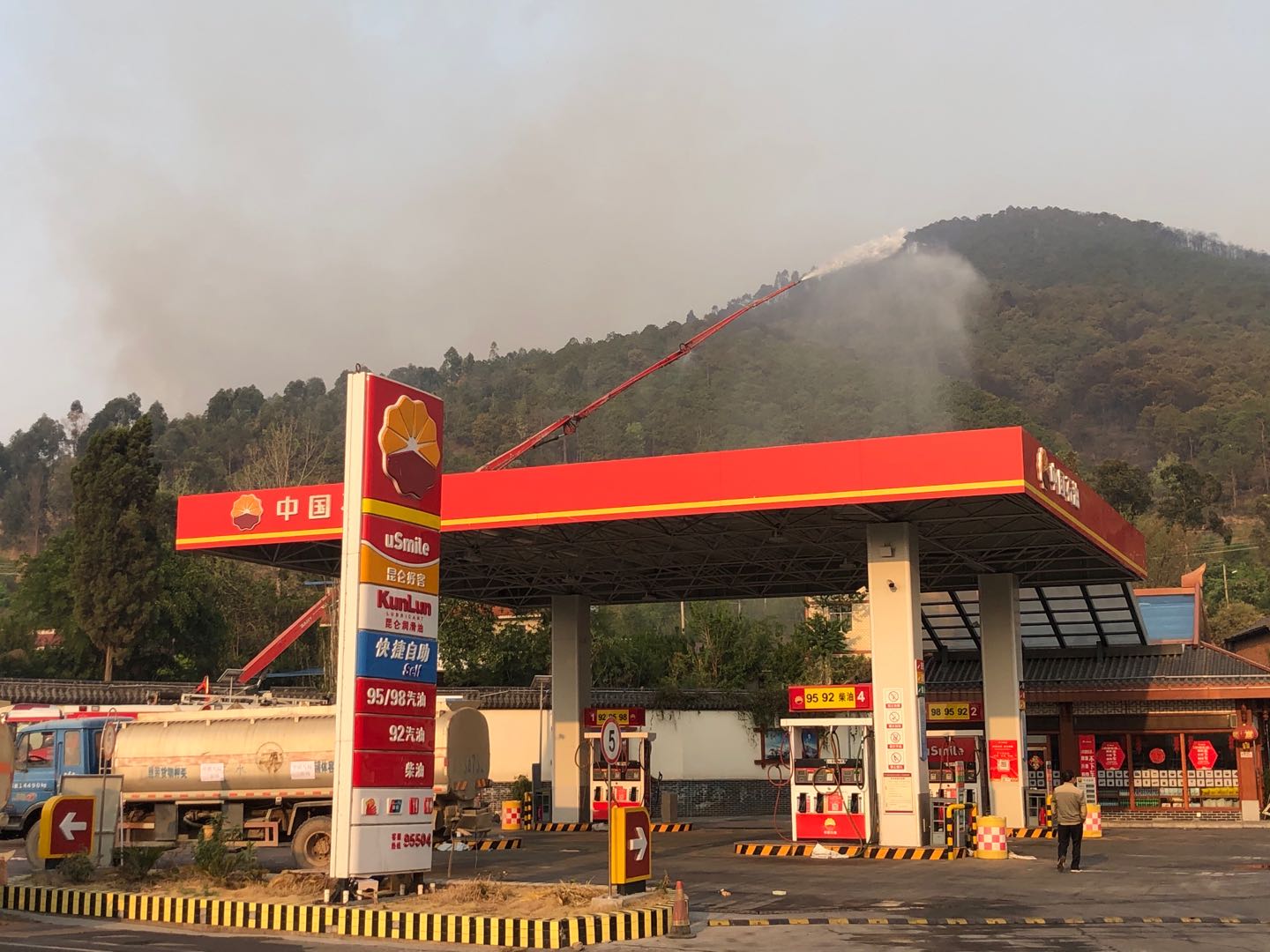 2020年4月1日19時(shí)風(fēng)力極大,山火正向著瀘山東麓逼近,在京昆線、國道248和濱海南路的三岔路口附近,坐落著一座中國石油海南加油站,加油站處于交通要道,業(yè)務(wù)量大,加油站儲(chǔ)油20000多公升,山火逼近加油站僅剩數(shù)百米。在這危急時(shí)刻,公路三分公司西昌繞城TJ2標(biāo)項(xiàng)目部積極響應(yīng)西昌市號(hào)召,帶人帶車日夜堅(jiān)守加油站。4月2日凌晨1點(diǎn),山火已經(jīng)到達(dá)山腳,距離加油站僅有300米左右,西昌繞城TJ2標(biāo)項(xiàng)目經(jīng)理陳兵立即調(diào)撥1臺(tái)水車給消防車加水,另外兩臺(tái)水車輪番給加油站外的樹木及地面灑水降溫,項(xiàng)目職工曾世浩、鄒清勇同志緊急響應(yīng),在中國石油海南加油站場(chǎng)地中用水車噴灑加油站外面的大樹及地面,副經(jīng)理何恒、安全科長(zhǎng)潘耳針、黨員李文分別給每臺(tái)水車作警示、觀察火勢(shì)。4月2日8時(shí)40分,在消防官兵及四川路橋搶險(xiǎn)救援突擊隊(duì)的共同努力下,成功阻斷山火向加油站蔓延,明火基本熄滅,火災(zāi)隱患暫時(shí)消除,全體人員及設(shè)備安全撤離。